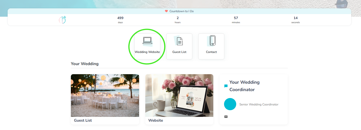 Log in to your dashboard. After logging in and accessing your homescreen, click the Square labeled Wedding Website