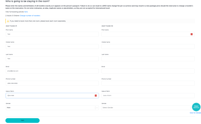 Choose the total number of adults and children traveling. Be sure to enter each child’s date of birth. Then select your travel dates.